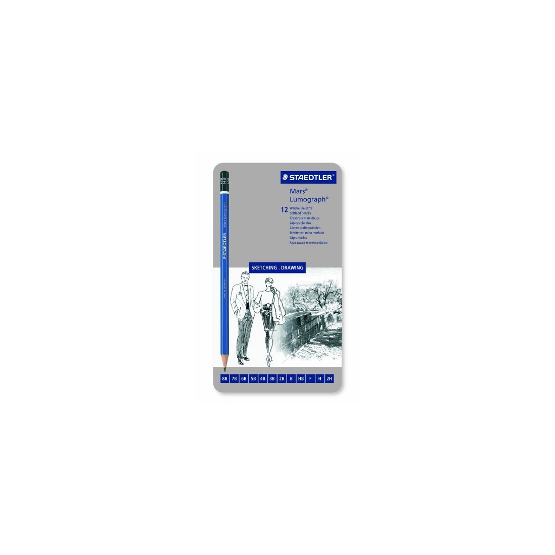 Set en caja de metal de 12 lápices Staedtler Mars Lumograph con graduacionese medias: 6B, 5B, 4B, 3B, 2B, B, HB, F, H, 2H, 3H, 4H. Calidad premium para escribir, dibujar y esbozar sobre papel y papel vegetal.
