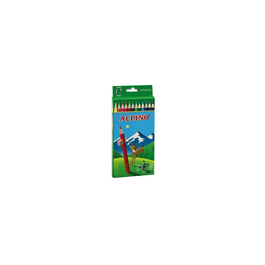 Clásicos lápices de colores Alpino, una caja con 12 lápices de cuerpo hexagonal. Ideal para uso escolar.