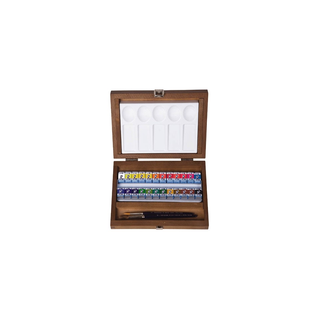 Set Van Gogh de acuarelas presentada en una caja de madera ideal para transportar. Contiene 24 pastillas de acuarela, una amplia paleta y dos pinceles. Gran poder colorante con colores radiantes y muy transparentes. Elevada resistencia a la luz. Se pueden mezclar fácilmente.