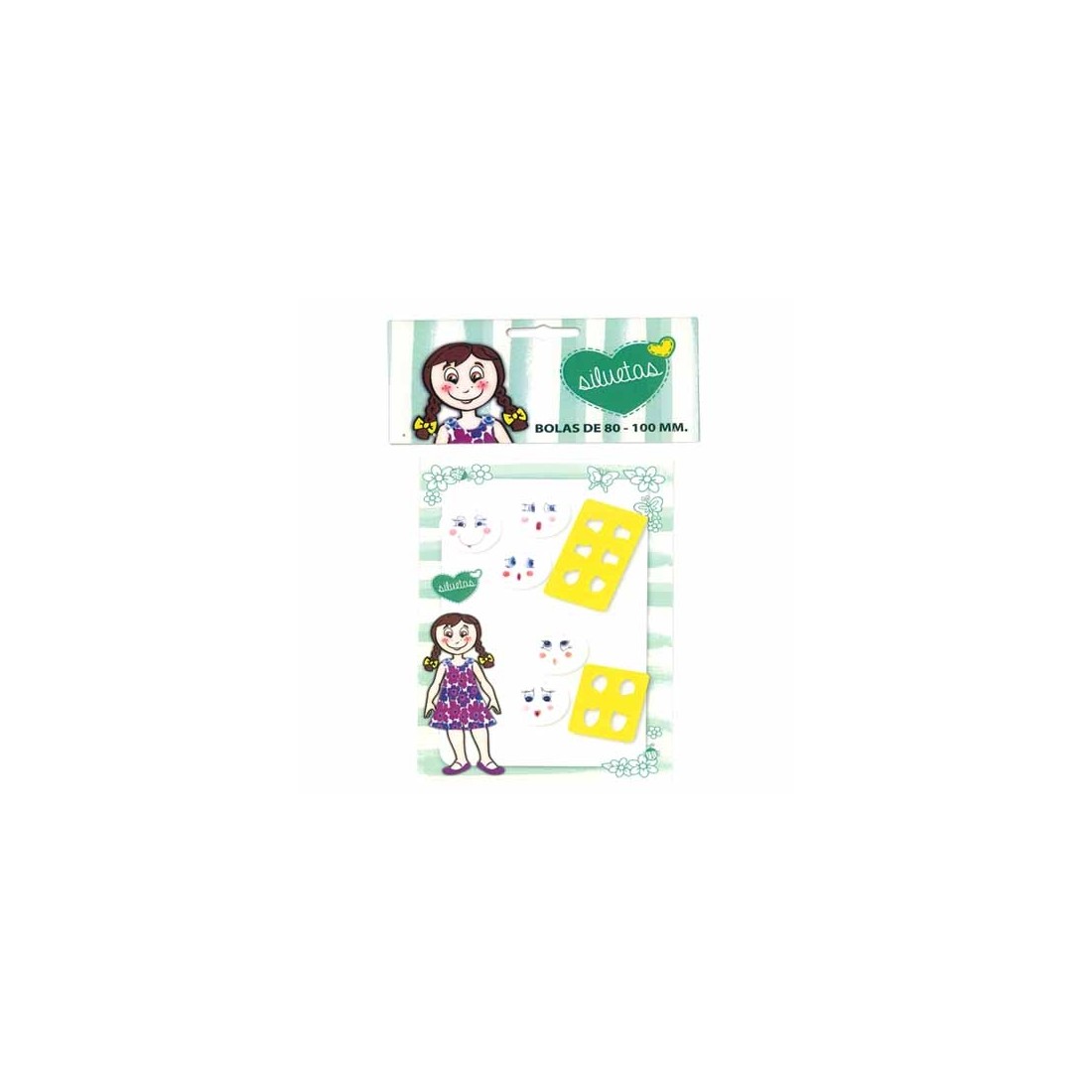 5 plantillas flexibles con las que podrás hacer varias combinaciones de caras de muñecas. Las formas incluidas son bolas de entre 80 y 100 mm. Diseños exclusivos.
